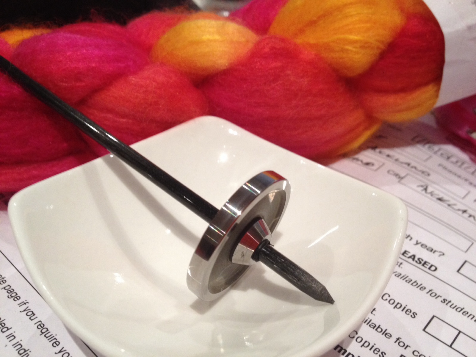 And this. A supported spindle made from used photocopier parts and carbon fibre, and some lovely merino/silk to learn with.